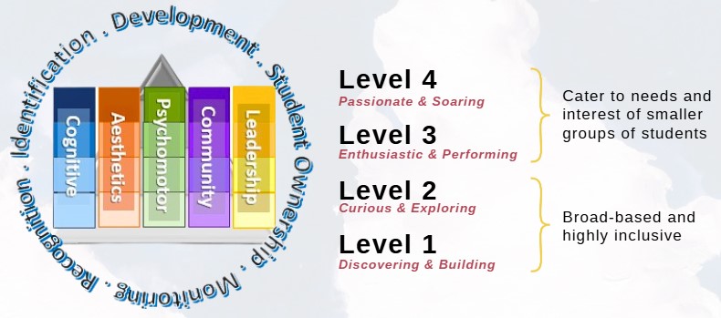 The different opportunities within each domain are further structured into four levels in accordance to Treffinger’s Levels of Service approach for talent development. Broadly speaking, Levels 1 and 2 programmes are broad-based and highly-inclusive, while Levels 3 and 4 programmes place greater emphasis on catering to the needs and interests of smaller groups of students.