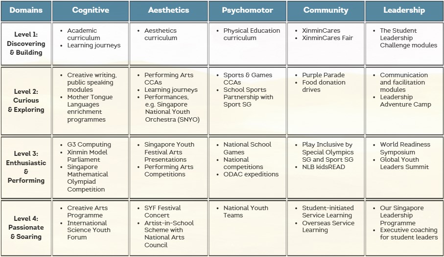 Our goal is for every Xinmin student to reach at least Level 2 in all five domains when he/she graduates. The following table provides examples of the talent development opportunities available for different domains and levels: