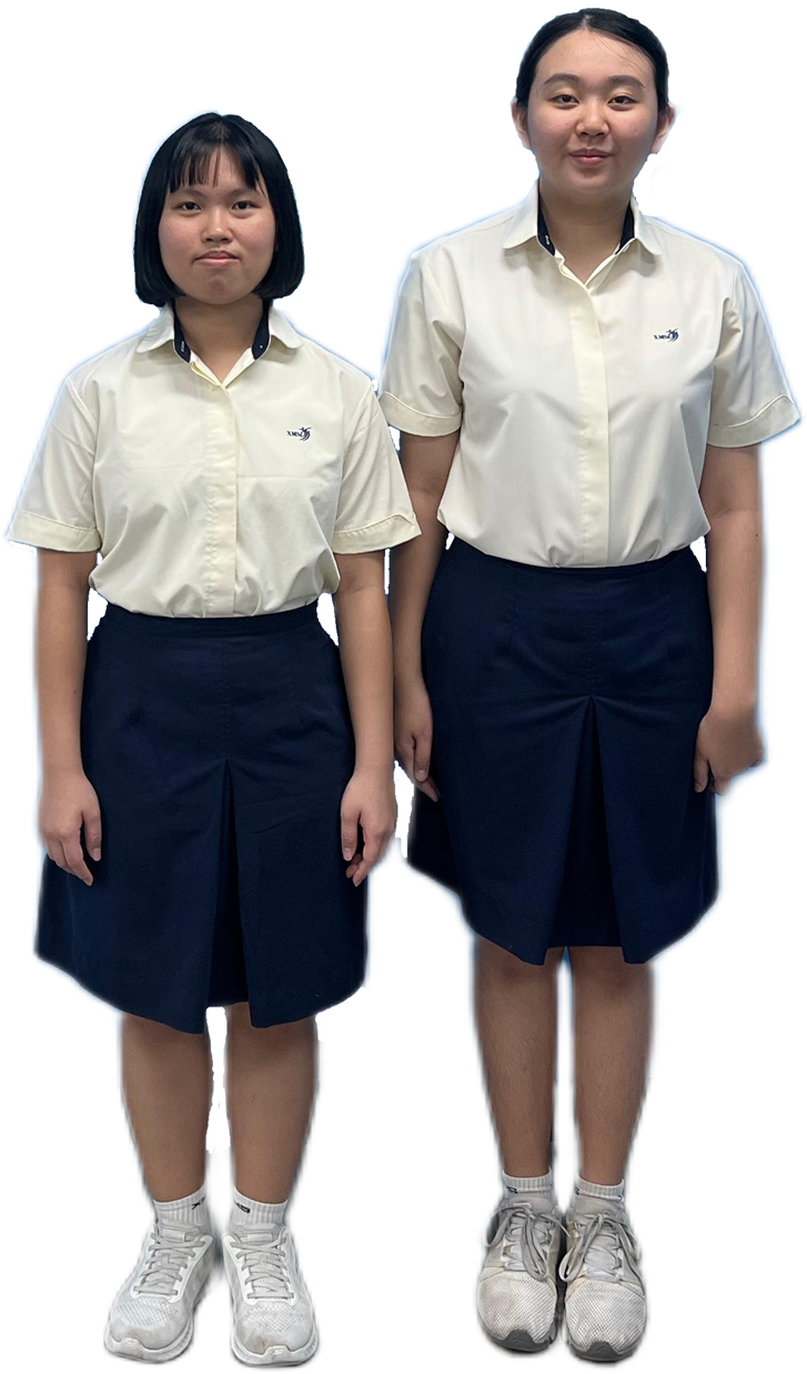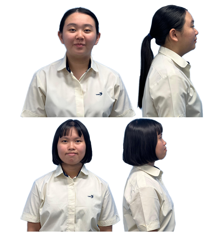 Girls with long hair must tie or pin it up neatly with black, dark blue or dark brown hair accessories, ensuring that the fringe does not touch the eyebrows or is always pinned up as shown here.