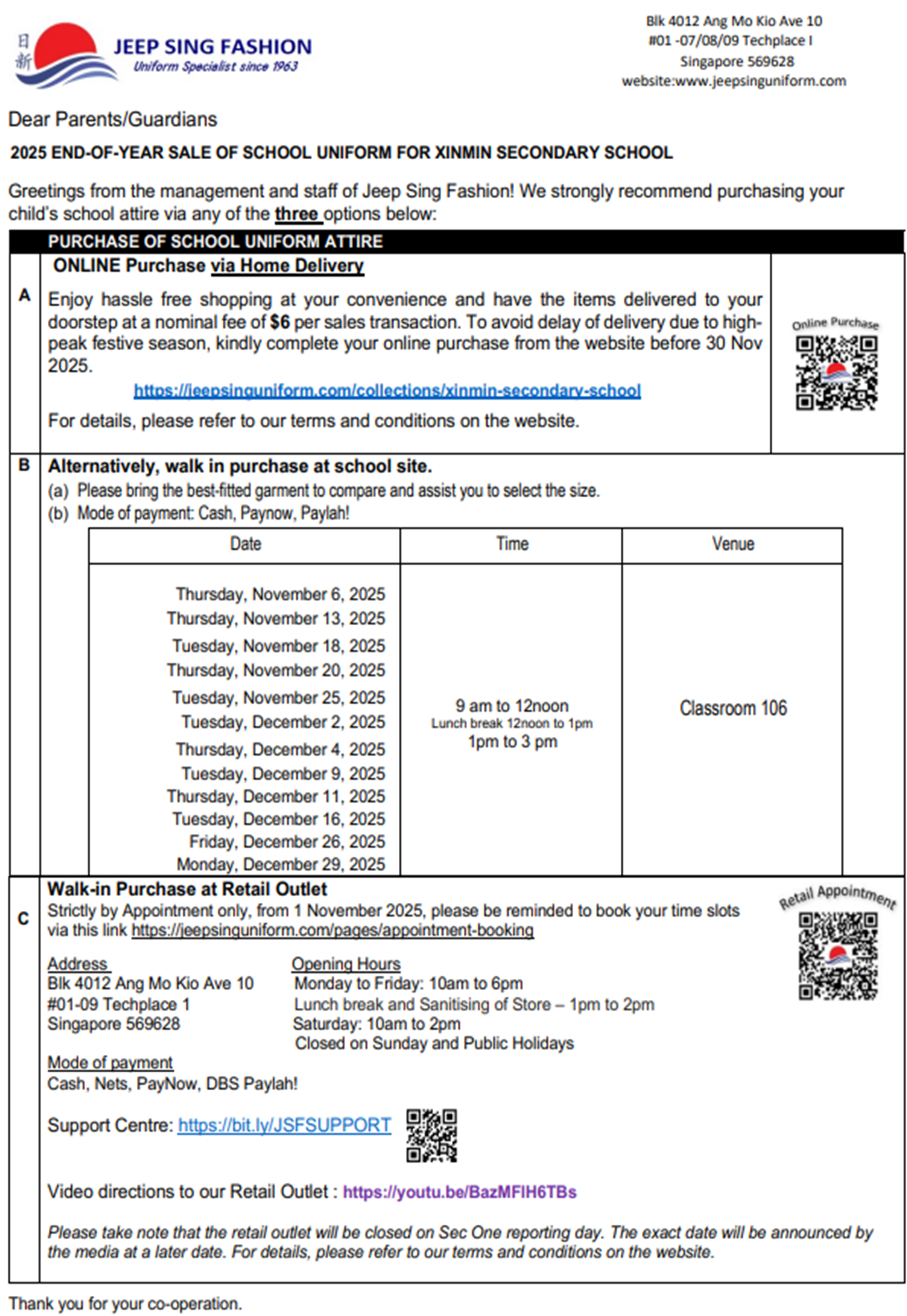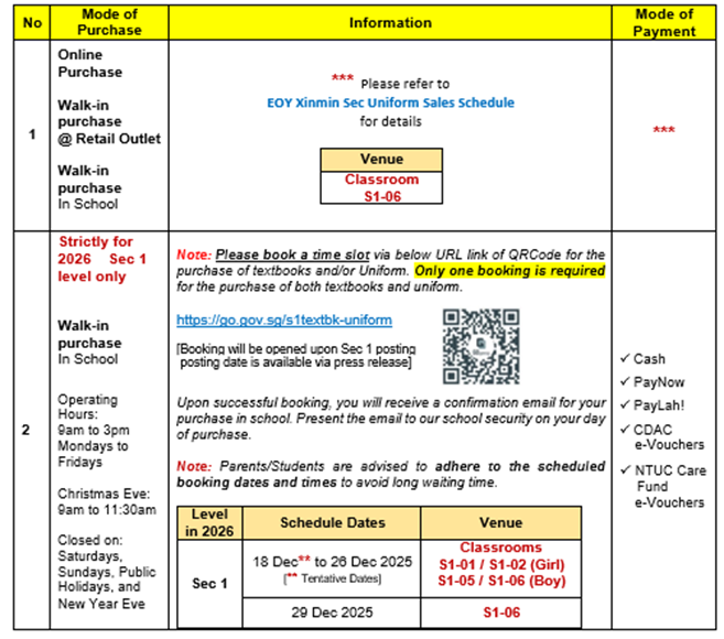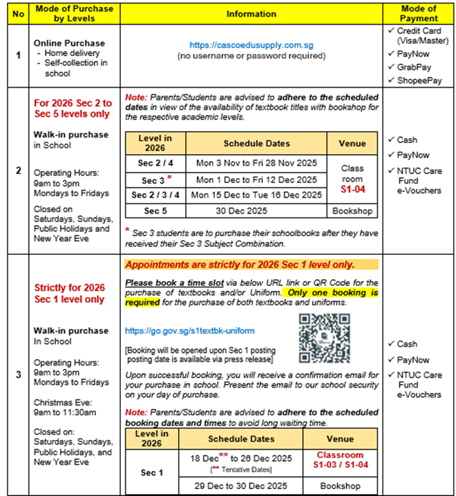 To book a slot: https://go.gov.sg/s1textbk-uniform (For 2026 Sec 1 only)